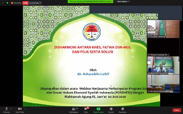 Webinar yang menghadirkan 4 narasumber dari para pakar ekonomi Syariah ini menyampaikan materi yang saling berkaitan. Penyampaian materi diawali oleh Ketua Kamar Agama MA-RI sekaligus mewakili praktisi hukum disampaikan Yang Mulia Dr. H. Amran Suadi, S.H, M.H., M.M dengan judul Pembaharuan KHES dan akomodasi Fatwa DSN MUI Serta Implikasinya bagi Penegakkan Hukum di Peradilan Agama. Kemudian dilanjutkan oleh 3 pemateri dari kalangan akademisi yaitu Prof. Dr. H. Yaswirman, S.H., M.A dengan judul Politik Hukum Ekonomi Syariah (KHES, Fatwa DSN MUIdan POJK) di Indonesia, Prof. Dr.H. Muhammad Amin Suma, SH, MA, MM mengenai Dinamisasi Kontekstualisasi Fatwa DSN MUI sebagai Sumber Hukum Materiil dan Formil Ekonomi Syariah), dan diakhiri H. Ah. Azharuddin Lathif, M.Ag., M.H mengenai Disharmonisasi antara KHES, Fatwa DSN MUI dan POJK serta Solusinya.