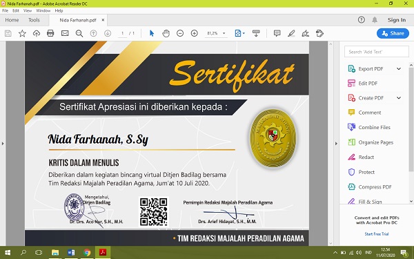 Dalam kesempatan yang sama Nida mengatakan, selama dua kali mengikuti webinar bersama redaktur majalah Peradilan Agama ia merasa sangat bersyukur. Karena selain mendapatkan ilmu yang bermanfaat dan e-sertifikat, ia juga berkesempatan bertatap muka dengan Tim Redaktur Majalah Peradilan Agama dan rekan-rekan hakim terutama angkatan VIII di seluruh Indonesia. Walaupun dilakukan melalui jarak jauh, namun hal tersebut tidak mengurangi semangatnya untuk menyimak setiap materi yang disampaikan. Semoga ilmu yang diperoleh bermanfaat tidak hanya untuk diri pribadi, namun juga bagi satkernya.