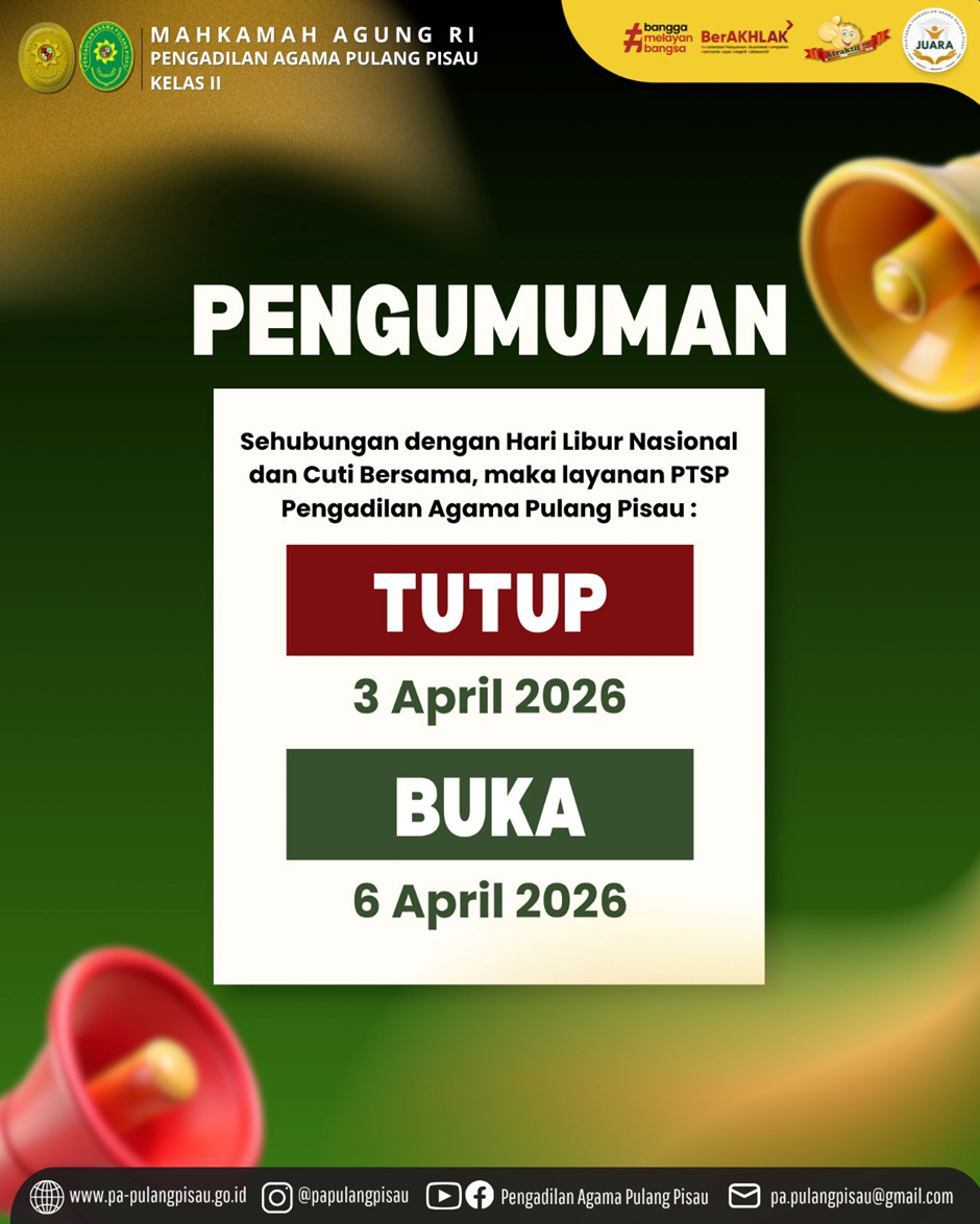 Semoga dengan pengisian LHKPN ini seluruh Pejabat dan Aparat PA Pulang Pisau selalu bertekad dan berkomitmen untuk melayani masyarakat dengan adil, jujur, ikhlas, profesional, bebas dari gratifikasi, korupsi, kolusi dan nepotisme.