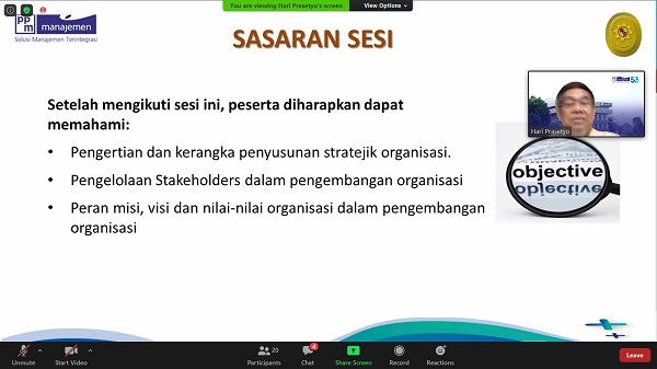 Sasaran pada materi ini peserta diharapkan memahami kerangka penyusunan perencanaan strategis organisasi, pemangku kepentingan organisasi (stakeholders), visi dan misi organisasi, cara melakukan analisis lingkungan eksternal dan internal organisasi serta dampaknya bagi organisasi, cara menetapkan sasaran organisasi dan strategi pencapaiannya serta cara mengembangkan program implementasi strategi.