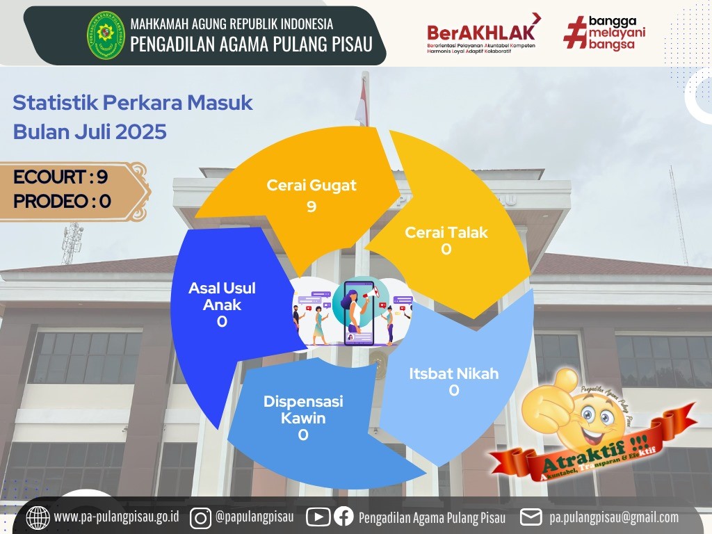 Sementara, statistik perkara yang masuk sepanjang bulan Juli tahun 2025 adalah 9 (Sembilan) perkara E-Court. Sejak awal bulan Juli tahun 2025, Pengadilan Agama Pulang Pisau telah kembali melaksanakan persidangan dengan sistem Majelis dengan jumlah Panitera 1 (satu) orang, Panitera Muda sebanyak 2 (dua) orang dan Panitera Pengganti sebanyak 1 (satu) orang. Kemudian di awal bulan Agustus 2025, Pengadilan Agama Pulang Pisau mendapatkan tambahan yaitu 1 (satu) orang Panitera Pengganti Pengadilan Tinggi Agama (PTA) Palangka Raya yang diperbantukan di PA Pulang Pisau. Dengan komposisi tersebut diharapkan dapat meningkatkan kualitas pelayanan bagi masyarakat Kabupaten Pulang Pisau.