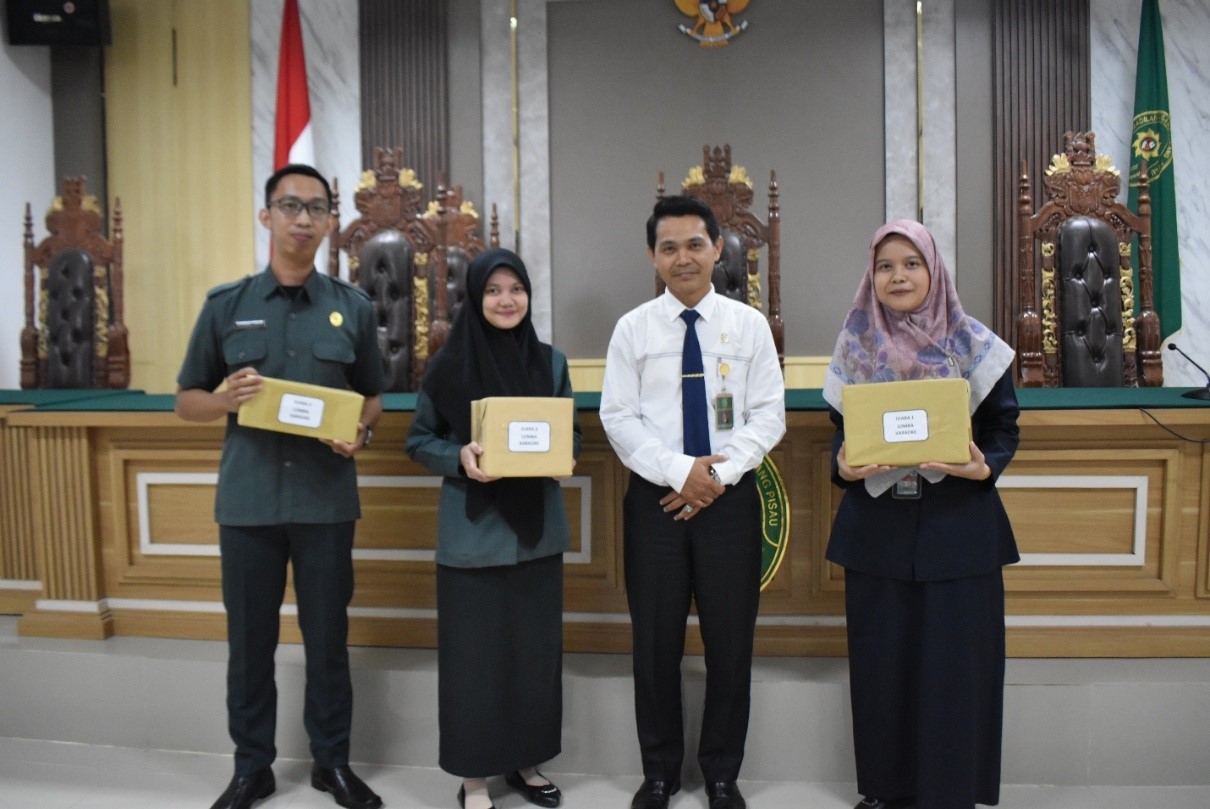 Selasa (19/8/2025) bertempat di Ruang Sidang Utama Pengadilan Agama Pulang Pisau, setelah rangkaian kegiatan upacara HUT Mahkamah Agung RI Ke-80 serta Tasyakuran dan Doa bersama, kegiatan hari ini dilanjutkan dengan pengumuman dan pemberian hadiah bagi para pemenang lomba dalam rangka semarak HUT Kemerdekaan Republik Indonesia Ke-80, Kasubbag Kepegawaian, Organisasi dan Tata Laksana, Juanti, S.E. menerima hadiah juara I lomba karaoke dengan perolehan nilai 4.300, sedangkan juara II dan juara III diraih oleh Muhammad Rapli dan Muhammad Rosidin, A.Md. dengan masing-masing perolehan nilai 3.700 dan 2.800. Hadiah tersebut diserahkan langsung oleh Ketua Pengadilan Agama Pulang Pisau, Bapak Wiryawan Arif S.H.I., M.H.