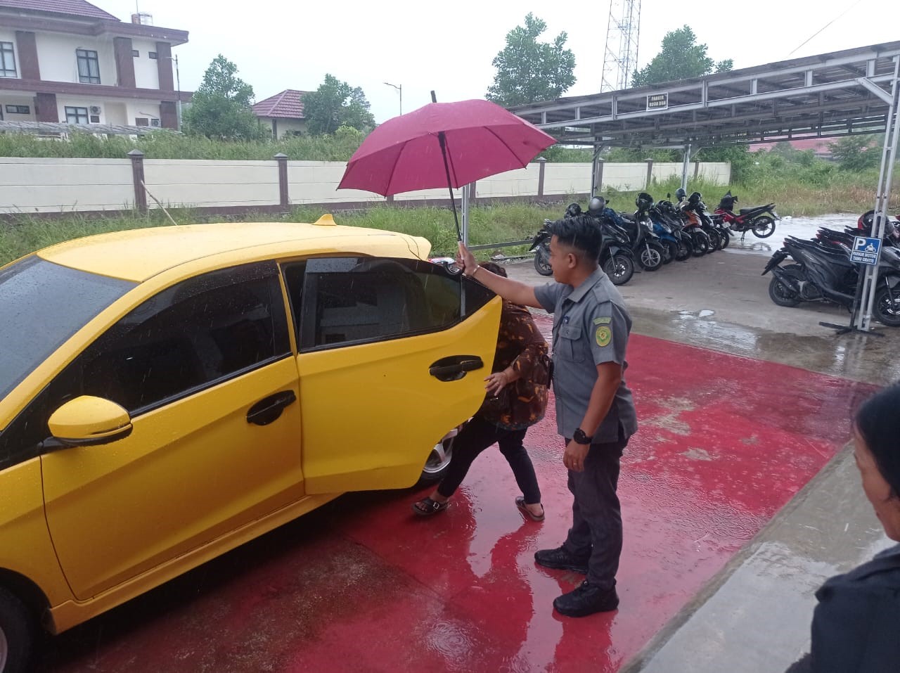Dengan turunnya air hujan, cukup merepotkan para pengunjung untuk masuk maupun keluar dari ruang pelayanan untuk menuju ke parkiran maupun memasuki kendaraannya. Namun, petugas Pelayanan Pengadilan Agama Pulang Pisau siaga dan tetap memberikan pelayanan terbaiknya dalam segala cuaca yaitu dengan adanya petugas Pelayanan Tesar Satria Nugraha, S.H. yang secara sigap membawakan payung yang diperuntukkan khusus bagi pengunjung dan menggunakan payung tersebut untuk mencegah ataupun menahan air hujan yang mengguyur para pengunjung. Dengan adanya Inovasi Payung, diharapkan dapat memberikan manfaat bagi masyarakat yang berkunjung ke PA Pulang Pisau agar terhindar dari keadaan basah kuyup saat cuaca hujan.