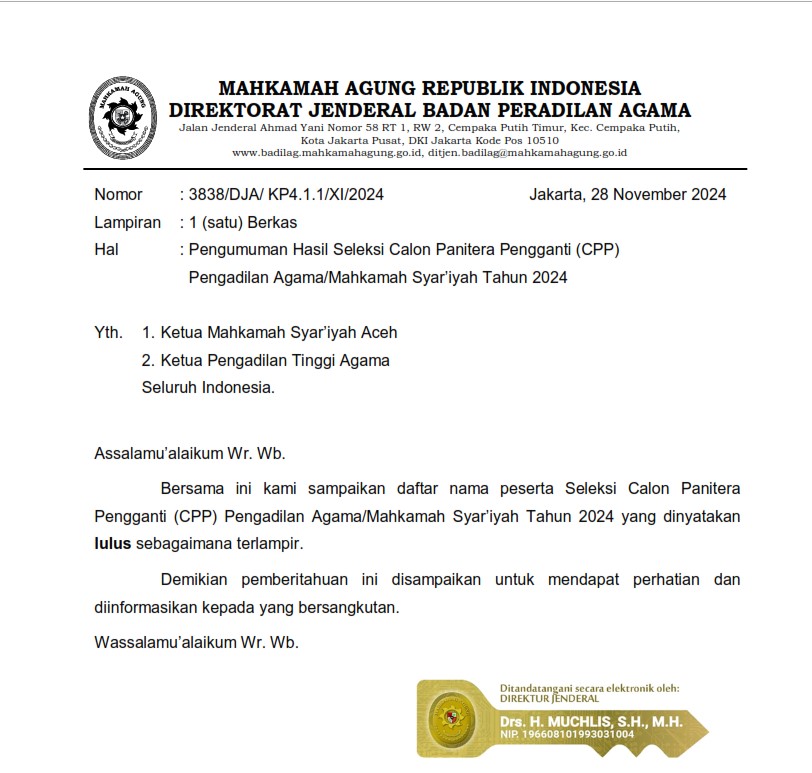 Kamis (28/11/2024), Direktorat Jenderal Badan Peradilan Agama merilis daftar nama peserta Seleksi Calon Panitera Pengganti (CPP) Pengadilan Agama/ Mahkamah Syar’iyah Tahun 2024 yang dinyatakan lulus. Berdasarkan Surat Direktur Jenderal Badan Peradilan Agama Nomor 3838/DJA/ KP4.1.1/XI/2024 tanggal 28 November 2024 perihal Pengumuman Hasil Seleksi Calon Panitera Pengganti (CPP) Pengadilan Agama/ Mahkamah Syar’iyah Tahun 2024, Analis Perkara Peradilan Pengadilan Agama Pulang Pisau, Andini Ayu Pangestu, S.H. dinyatakan lulus seleksi Calon Panitera Pengganti (CPP) Tahun 2024 dengan nomor urut 45.