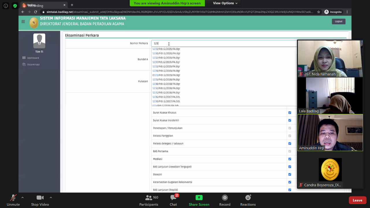 Pulang Pisau - Selasa, 09 Maret 2021 pukul 13.00 s.d 15.00 WIB, Hakim PA Pulang Pisau mengikuti Sosialisasi e-Eksaminasi Tahap I Tahun 2021 secara virtual yang diselenggarakan oleh Ditjen Badan Peradilan Agama Mahkamah Agung Republik Indonesia dan diikuti oleh sebanyak 160 (seratus enam puluh) peserta. Kegiatan ini dilaksanakan sebagai upaya agar peserta Eksaminasi dapat memahami teknis pelaksanaan eksaminasi putusan menggunakan aplikasi yang telah disediakan.