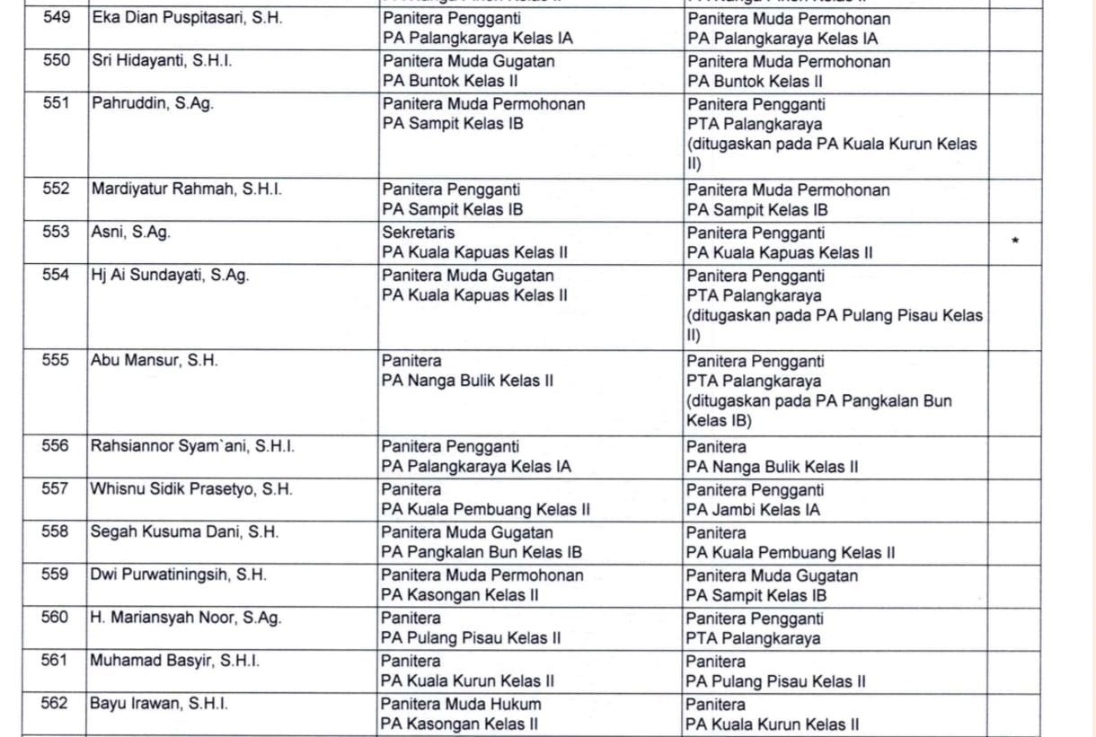 Adapun Panitera Penggganti Pengadilan Tinggi Agama Palangka Raya yang akan diperbantukan di Pengadilan Agama Pulang Pisau tersebut adalah Hj. Ai Sundayati, S.Ag yang saat ini menjabat sebagai Panitera Muda Gugatan Pengadilan Agama Kuala Kapuas. Selain nama beliau, Pengadilan Agama Pulang Pisau juga akan kedatangan Panitera baru yang sebelumnya bertugas di Pengadilan Agama Kuala Kurun yaitu Muhammad Basyir, S.H.I. Dengan adanya tambahan pegawai di PA Pulang Pisau diharapkan dapat meningkatkan kualias pelayanan kepada masyarakat pencari keadilan di bumi handep hapakat.