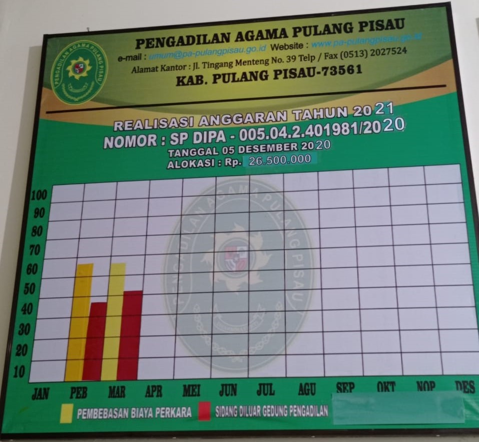 Realisasi anggaran pada DIPA 01 di Pengadilan Agama Pulang Pisau sampai dengan bulan Maret 2021 dalam hal belanja pegawai dengan persentase 18,66%. Sedangkan belanja barang dengan persentase 22,03%. Sedangkan Realisasi anggaran pada DIPA 04 di Pengadilan Agama Pulang Pisau dalam hal pembebasan biaya perkara dengan persentase 57% dan sidang di luar gedung pengadilan dengan persentase 51%.
