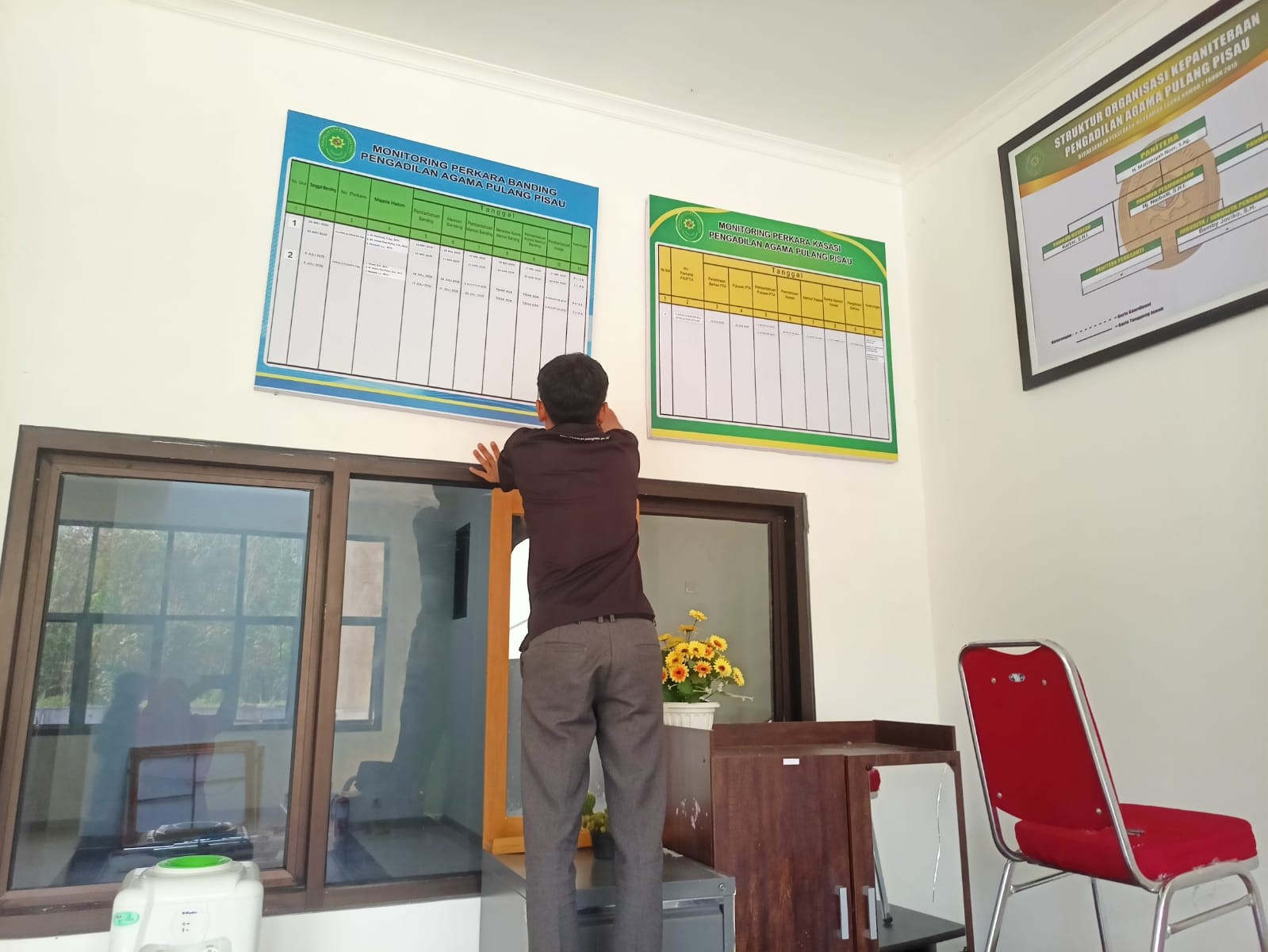 Jumat, 02 Agustus 2024. Semenjak resmi bertempat di gedung baru yang terletak di Jalan Trans Kalimantan, Kecamatan Kahayan Hilir, Kabupaten Pulang Pisau sejak awal bulan Juli tahun 2024 lalu hingga kini telah genap 1 (satu) bulan, Pengadilan Agama Pulang Pisau secara terus-menerus melengkapi sarana dan prasarana yang ada di dalam gedung salah satunya yaitu dengan pemasangan beberapa banner diantaranya mengenai banner keadaan perkara, banner struktur organisasi Kepaniteraan dan banner-banner lainnya.