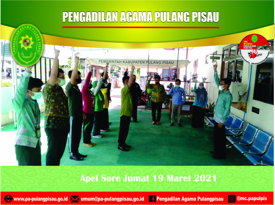 Apel sore setiap hari Jumat merupakan kegiatan rutin yang dilaksanakan di Pengadilan Agama Pulang Pisau. Selain untuk melaksanakan kedisiplinan, juga menjadi sarana untuk memupuk kebersamaan dan kekompakan antar pegawai. Jumat (19/03/2021) apel sore dilakasanakan di halaman Kantor Pengadilan Agama Pulang Pisau pada pukul 14.00 WIB. Apel dipercepat dari pukul yang seharusnya yakni pukul 16.00 WIB. Dikarenakan terdapat salah satu pegawai di Pengadilan Agama Pulang Pisau yang ber-status Reaktif Virus Covid-19. Sehingga kantor harus segera diberi Desinfektan.