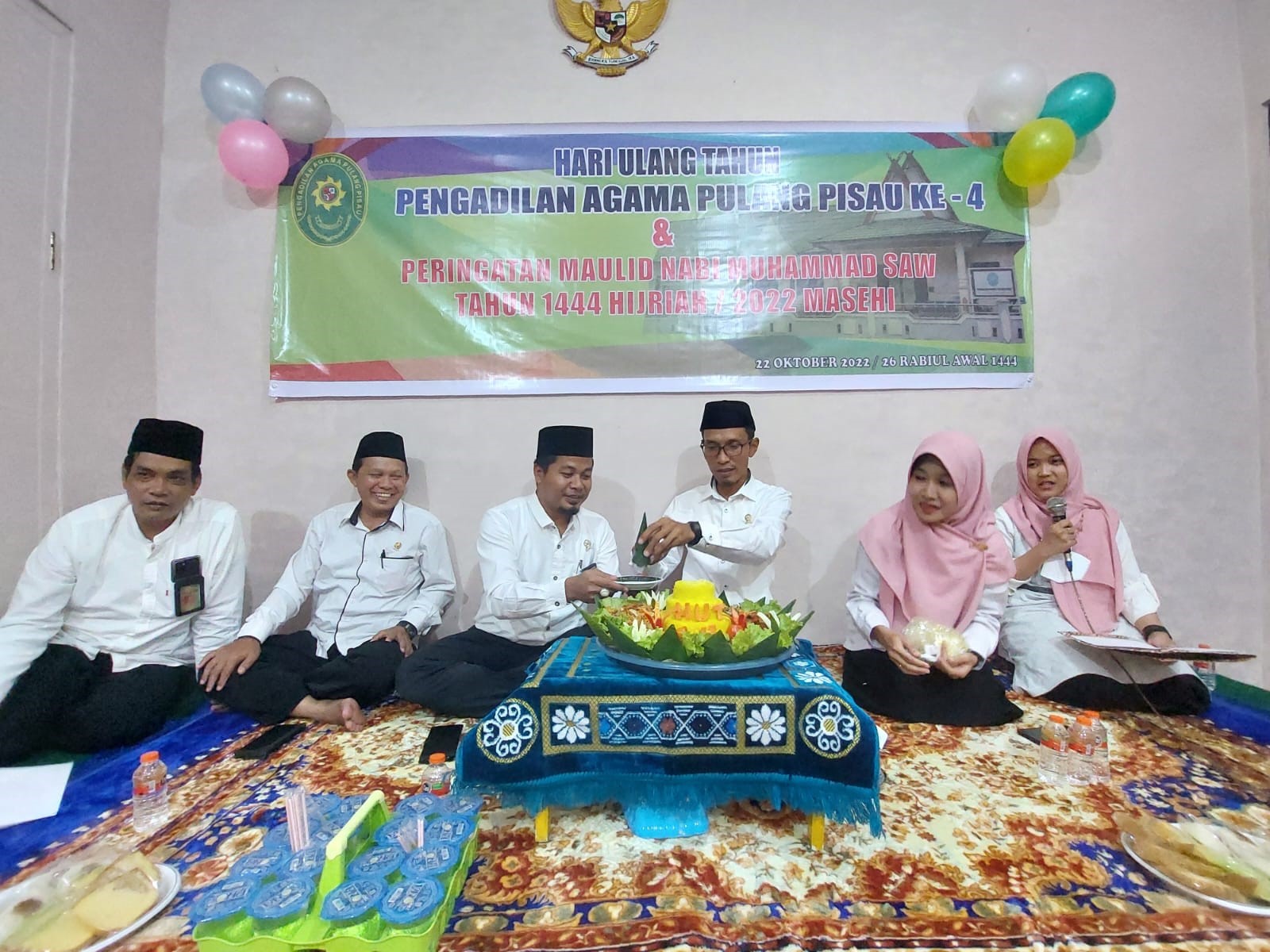 Pada hari Jumat, 21 Oktober 2022 pukul 13.00 WIB bertempat di Ruang Sidang Pengadilan Agama Pulang Pisau melaksanakan pemotongan tumpeng oleh Keluarga Besar Pengadilan Agama Pulang Pisau dalam rangka tasyakuran Hari Ulang Tahun Pengadilan Agama Pulang Pisau Ke – 4 tahun. Kegiatan ini sebagai bentuk syukur atas bertambahnya usia Pengadilan Agama Pulang Pisau. Acara yang berlangsung sederhana dan khidmat ini dihadiri oleh Ketua, Wakil Ketua, Hakim, Pejabat Struktural dan Fungsional, seluruh karyawan-karyawati, PPNPN Pengadilan Agama Pulang Pisau dan Ketua beserta pengurus Dharmayukri Karini Cabang Pulang Pisau.