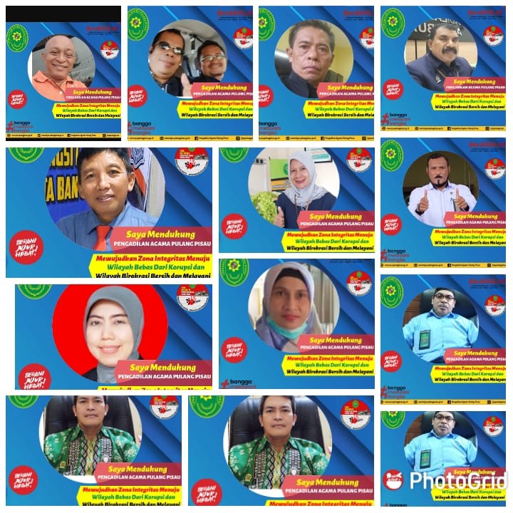 Pengadilan Agama Pulang Pisau terus berkomitmen untuk melaksanakan pembangunan Zona Integritas menuju Wilayah Bebas Korupsi (WBK). Komitmen tersebut direalisasikan dengan semangat untuk meningkatkan kualitas pelayanan publik yang prima kepada masyarakat, termasuk dengan menggalakkan public campaign pembangunan Zona Integritas melalui twibbon dari seluruh pegawai Pengadilan Agama Pulang Pisau.