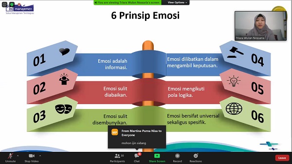 Hakim PA Pulang Pisau Mulyadi, Lc., M.H.I. mengikuti mengikuti Pelatihan Online Leading With Emotional Intelligence (Pemimpin Dengan Kecerdasan Emosi) yang diselenggarakan oleh Pusdiklat Manajemen dan Kepemimpinan Badan Litbang Diklat Hukum dan Peradilan Mahkamah Agung Republik Indonesia yang bekerja sama dengan Badan PPM Tahun Anggaran 2020. Rangkaian pelatihan ini dimulai dari hari Senin (03/08/2020) sampai hari Kamis (06/08/2020) diikuti oleh Para Hakim Tingkat Pertama dan Kepaniteraan dari berbagai lingkungan peradilan se Indonesia. Adapun pemateri pada pelatihan ini adalah Triara Wulan Nossaria, Mirta Amaranti, Maharsi Anindyajati dan lainnya serta dibantu oleh Destia Dwiyanti dan beberapa moderator lainnya.