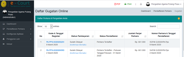 Pengadilan Agama Pulang Pisau mencatat bahwa pada periode Triwulan I tahun 2020 telah menerima sejumlah 63 perkara. Berdasarkan data di Kepaniteraan Pengadilan Agama Pulang Pisau tanggal 31 Maret 2020 menunjukkan dari 63 perkara terdaftar, 13 perkara diantaranya diterima pendaftarannya secara online melalui layanan E-Court. 13 Perkara tersebut hanya terdiri dari perkara gugatan, sedangkan untuk Perkara Permohonan belum ada yang terdaftar melalui layanan E-Court. Jumlah tersebut bisa dikatakan meningkat, mengingat pada tahun 2019 jumlah perkara PA Pulang Pisau yang diterima via E- Court hanya 11 perkara saja, namun baru terhitung 3 (tiga) bulan tahun 2020, PA Pulang Pisau telah menerima 13 perkara yg didaftar secara online melalui aplikasi E-Court.