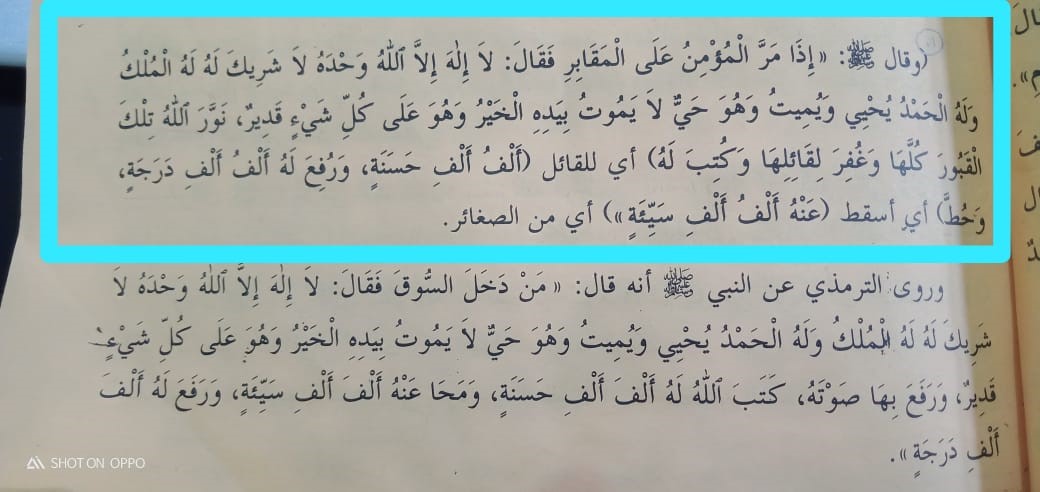 - Nabi Muhammad SAW bersabda: "Ketika seorang mu`min lewat pekuburan dan mengucapkan laa ilaaha illallah wahdahu la syarika lahu lahul mulku walahul hamdu yuhyi wayumitu wahuwa hayyun la yamut biyadihil khairu wahuwa ala kulli syai-in qadirun, maka Allah menerangi semua kuburan tersebut, mengampuni dosa yang membacanya, menulis sejuta kebaikan baginya, mengangkat baginya sejuta derajat, menghapus darinya sejuta kejelekan (dosa kecil)".