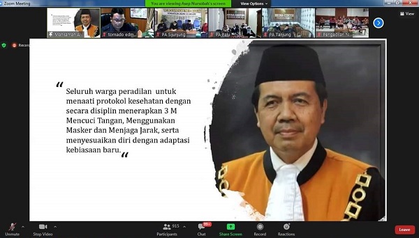 Sebelum disampaikan pembinaan oleh para narasumber, acara ini dibuka secara resmi oleh Ketua Mahkamah Agung Republik Indonesia Yang Mulia Bapak Dr. H.M. Syarifuddin, S.H., M.H. Dalam sambutannya, beliau juga berpesan agar seluruh warga peradilan senantiasa menerapkan 3 M, yaitu terus menggunakan masker, mencuci tangan dan menjaga jarak. Hal ini dikarenakan hingga saat ini sudah begitu banyak aparatur Peradilan yang terkonfirmasi positif covid 19, di antaranya 97 orang menjalani perawatan medis, 270 orang isolasi mandiri, 106 sembuh dan 9 orang meninggal dunia. Beliau juga mengajak kepada seluruh peserta yang hadir untuk mengirimkan doa kepada aparatur Peradilan yang telah meninggal dunia.