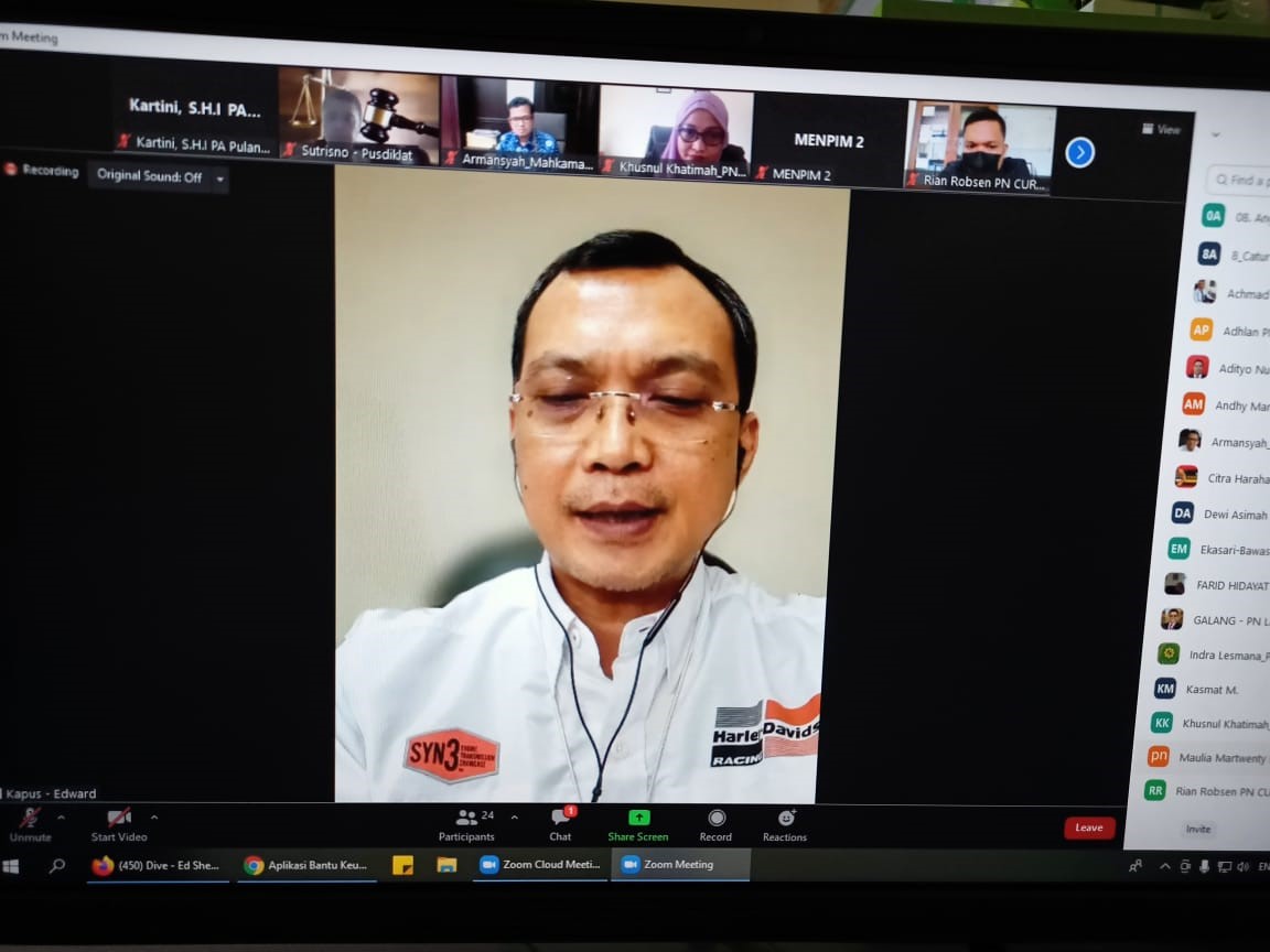 Pulang Pisau, Rabu 15 September 2021. Panitera Muda Gugatan Pengadilan Agama Pulang Pisau, Kartini, S.H.I mengikuti rapat Pengajar Muatan Lokal pada Pusdiklat Manajemen dan Kepemimpinan MA-RI berdasarkan Surat Undangan dari Badan Litbang Diklat Hukum dan Peradilan Mahkamah Agung RI tanggal 13 September 2021 Nomor: 339/Bld.4/Pim/9/2021. Rapat tersebut dilaksanakan melalui Teleconference Zoom di Satuan Kerja masing-masing yang dimulai pada pukul 15.00 WIB dan berakhir pada pukul 16.00 WIB.