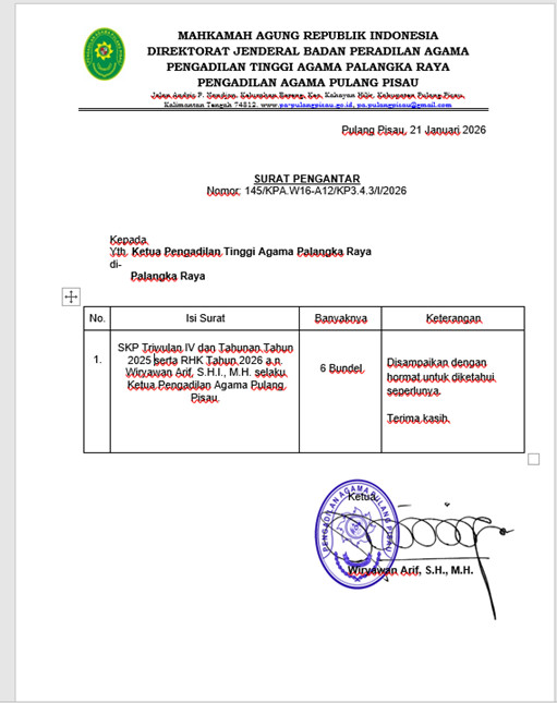 Pada hari Rabu, 28 Januai 2026 pukul 09.00 WIB. Sekretaris Pengadilan Agama Pulang Pisau, Rahmayani, S.H.I., M.H. telah menyerahkan Laporan Tahunan Tahun 2025 kepada Pengadilan Tinggi Agama Palangka Raya sebagai bentuk pertanggungjawaban kinerja lembaga selama satu tahun anggaran. Penyerahan laporan tersebut dilaksanakan sebagai tindak lanjut kewajiban pelaporan dan evaluasi pelaksanaan tugas pokok dan fungsi peradilan.