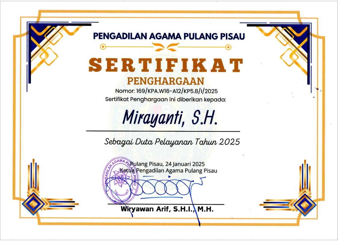Selain kegiatan pemberian reward juga dinobatkan Duta Pelayanan Pengadilan Agama Pulang Pisau di tahun 2025 pada acara tersebut. Adapun Duta Pelayanan yang terpilih adalah Mirayanti, S.H., selaku PPNPN Pengadilan Agama Pulang Pisau. Sebagai bentuk apresiasi pimpinan diberikan piagam penghargaan dan bingkisan yang diserahkan langsung oleh Ketua Pengadilan Agama Pulang Pisau Wiryawan Arif, S.H.I., M.H.