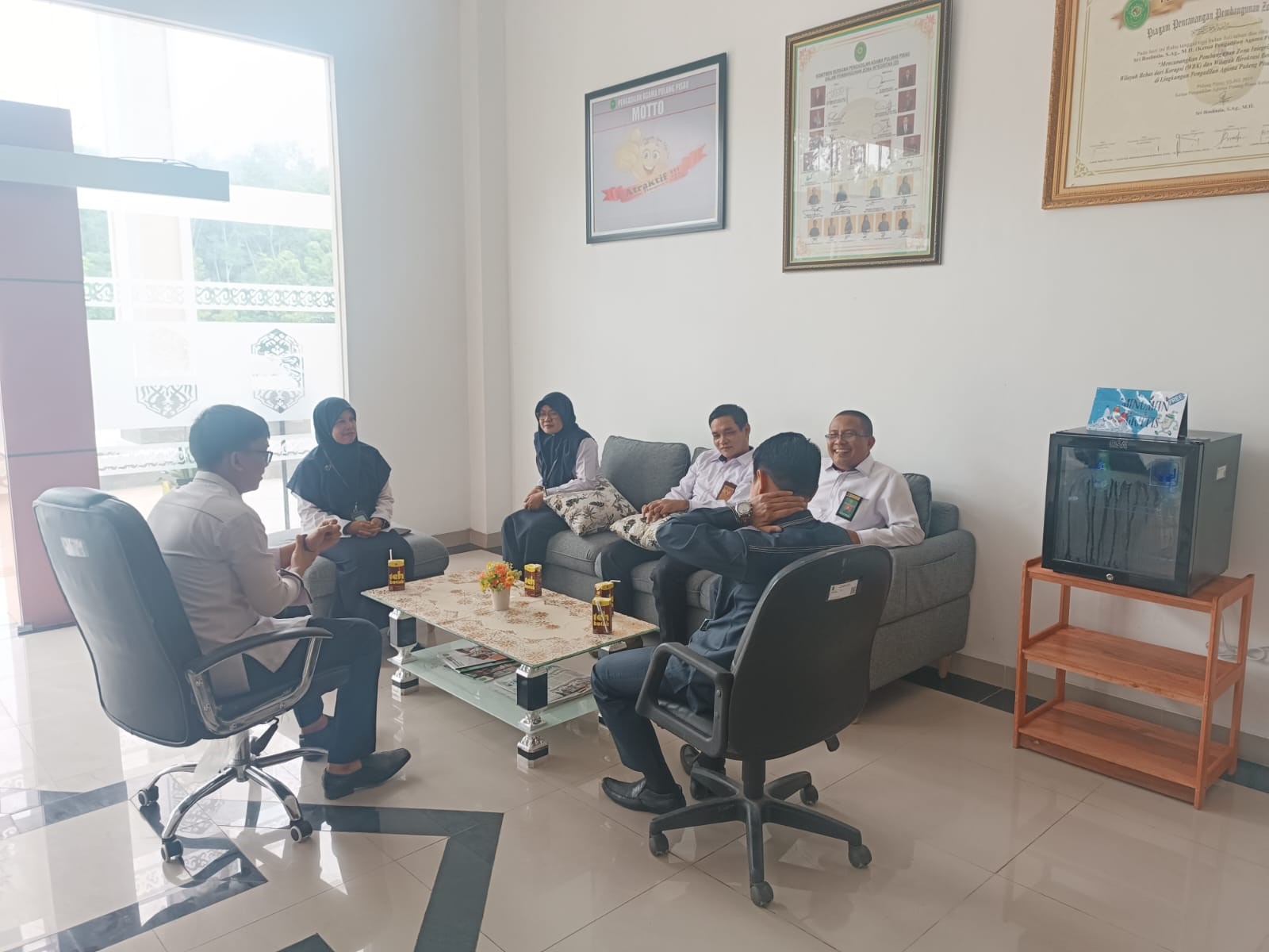 Senin, 23 Desember 2024, pukul 08.30 WIB untuk pertama kalinya Pengadilan Agama Pulang Pisau melaksanakan rapat terbatas dengan bertempat di ruang lobi setelah beberapa bulan yang lalu ruangan tersebut dilengkapi dengan sofa dan kulkas mini transparan atau Showcase display. Rapat tersebut dipimpin langsung oleh Ketua Pengadilan Agama Pulang Pisau Wiryawan Arif, S.H.I., M.H. dan diikuti oleh Hakim Rahmatiah, S.Sy., M.H., Sekretaris Yondri Harta, S.E., M.P., Panitera H. Mariansyah Noor, S.Ag., Panitera Muda Permohonan Hj. Norbaiti, S.H.I., Panitera Muda Gugatan Kartini, S.H.I dan Kepala Sub Bagian Perencanaan, TI dan Pelaporan Fandi Triandi, S.E.