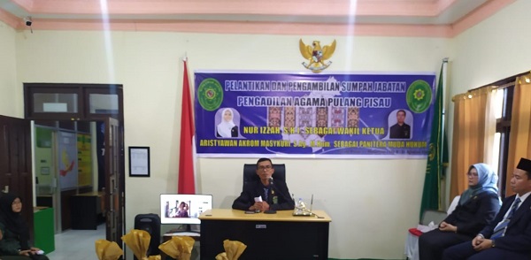 Pulang Pisau 31 Agustus 2020, di penghujung bulan Agustus ini PA Pulang Pisau kedatangan tamu istimewa. Setelah dilantik pada pukul 10.00 WIB, Wakil Ketua dan Panitera Muda Hukum PA Pulang Pisau memperkenalkan diri dalam acara ramah tamah yang diadakan secara kekeluargaan usai pelaksaan pelantikan dan pengambilan sumpah jabatan bertempat di ruang sidang Pengadilan Agama Pulang Pisau.
