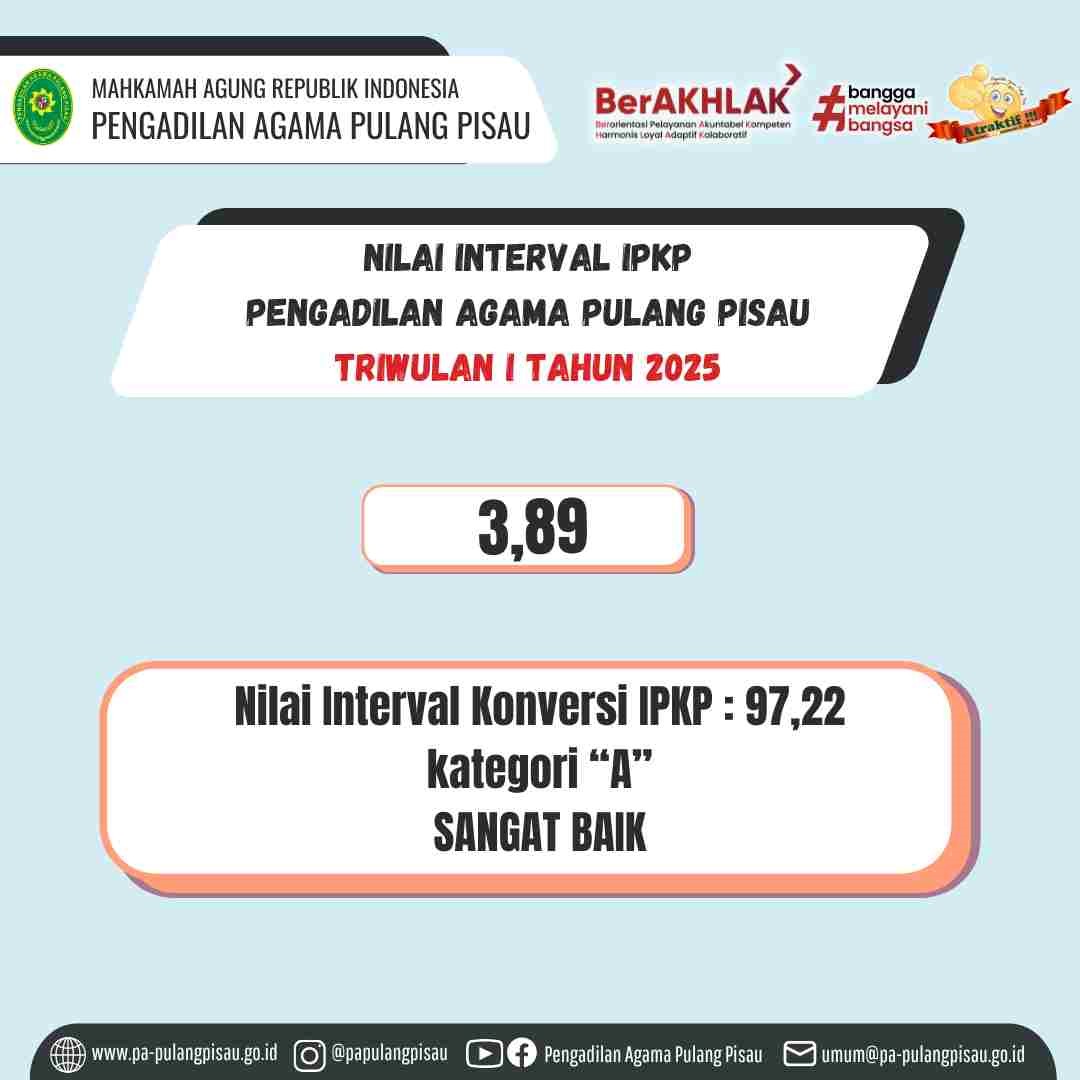 Adapun nilai Survey Kepuasan Masyarakat (SKM) Pengadilan Agama Pulang Pisau Triwulan I tahun 2025 mengalami peningkatan dari triwulan sebelumnya. Seiring dengan berlalunya Triwulan I tahun 2025, Pengadilan Agama Pulang Pisau telah membuat laporan nilai Indeks Persepsi Kepuasan Pelayanan (IPKP) atau yang dikenal dengan Survey Kepuasan Masyarakat (SKM) dengan nilai 3,89 dengan nilai interval konversi 97,22 dengan Kategori A, sangat baik. Sedangkan pada Triwulan sebelumnya atau Triwulan IV tahun 2025 sebelumnya berada pada angka 3,85 dengan nilai interval konversi 96,25.