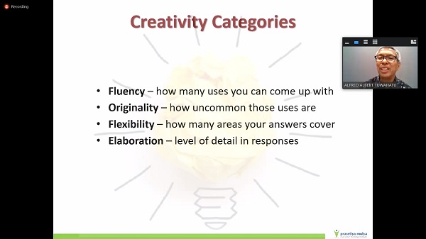 Selain itu pada pelatihan ini diuraikan salah satu teknik yang memicu kreatifitas seseorang yaitu dengan metode SCAMPER yang meliputi: