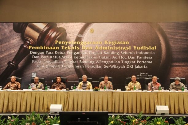 Jakarta - Humas: Aparatur pengadilan dari empat lingkungan peradilan se-wilayah DKI Jakarta mengikuti acara Pembinaan Teknis dan Administrasi Yudisial dari Pimpinan Mahkamah Agung pada hari Jum'at 14 Desember 2018 di ball room Hotel Swis Bell Jakarta. Sebanyak 385 Jumlah peserta yang hadir dalam acara tersebut terdiri dari Ketua, Wakil Ketua, Hakim, Hakim Ad Hoc, Panitera dan Sekretaris dari Pengadilan Tingkat Pertama dan Pengadilan Tingkat Banding di wilayah DKI Jakarta dan juga para Ketua Pengadilan Tingkat Banding di seluruh Indonesia. Pembinaan di Jakarta ini merupakan pembinaan yang kedua kalinya di tahun 2018 ini, sebelumnya dilakukan pada bulan Maret 2018, hal ini dilakukan karena tugas aparatur pengadilan di wilayah Jakarta sangat berat dan karena perkara–perkaranya sangat sensitif.